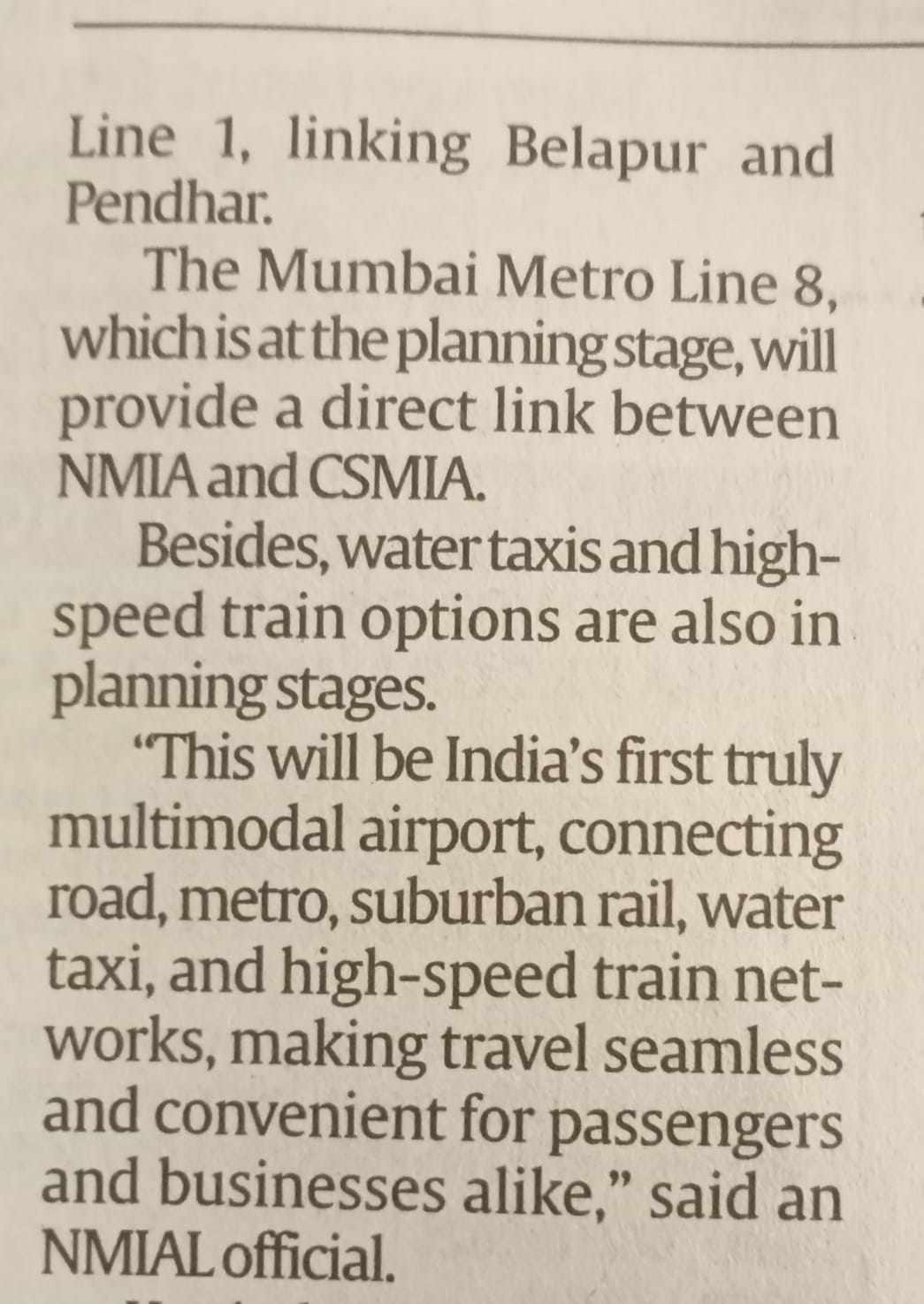 "The Mumbai Metro Line 8, which is at the planning stage, will provide a direct link between NMIA and CSMIA. Besides, water taxis and high-speed train options are also in planning stages. ... In its first phase of operations, the airport will have one runway."